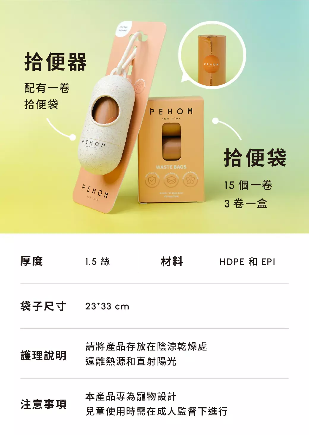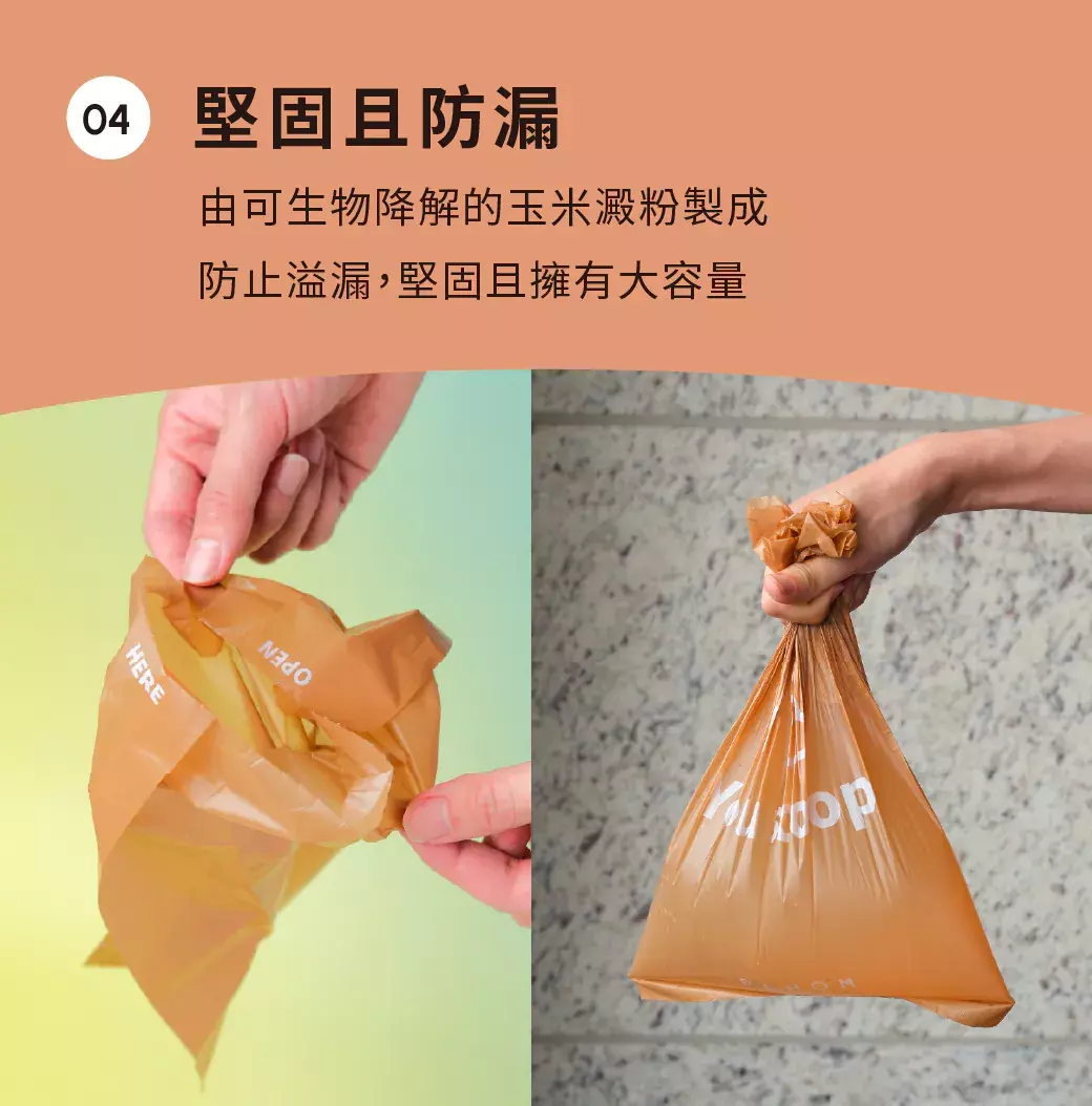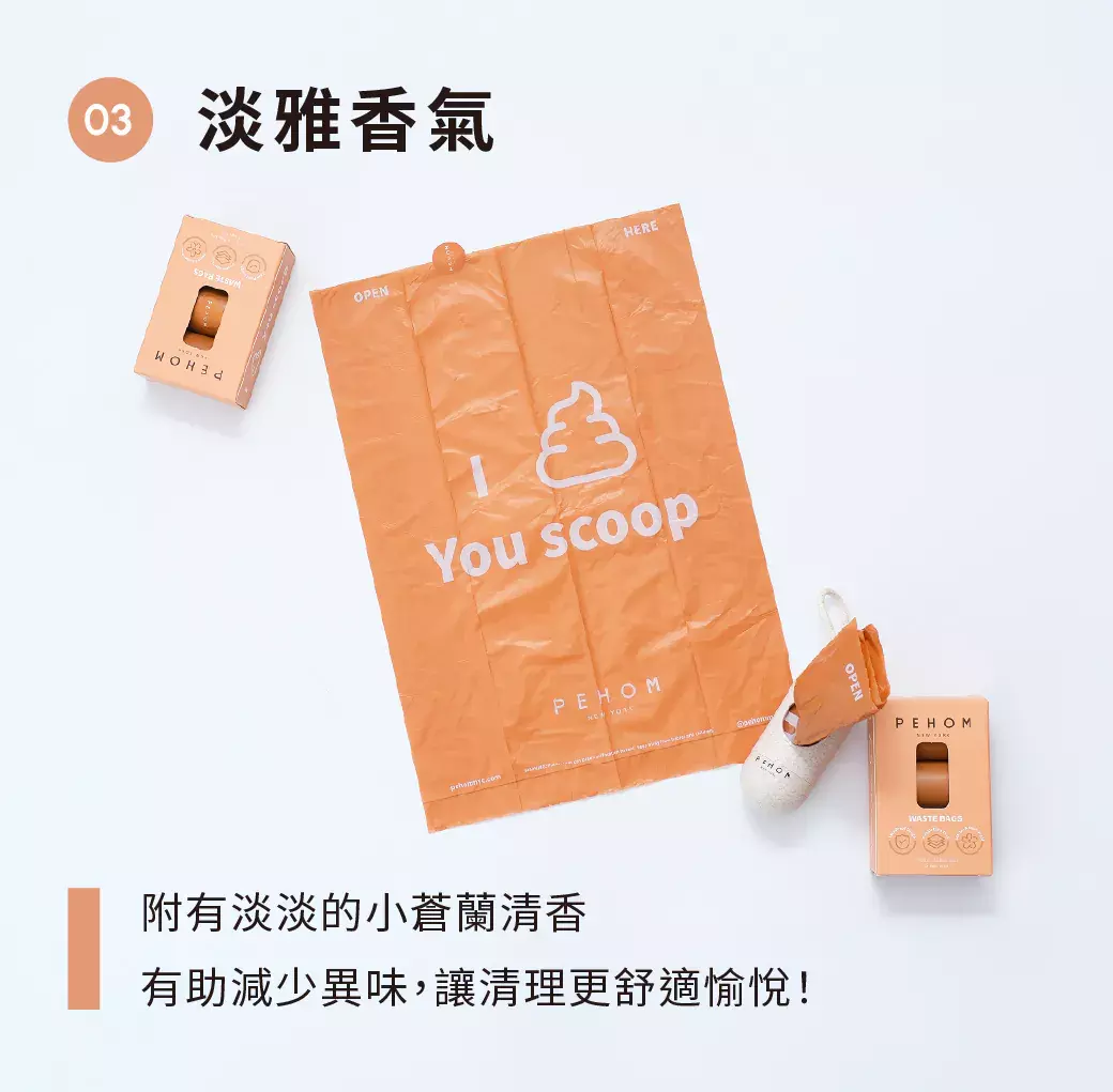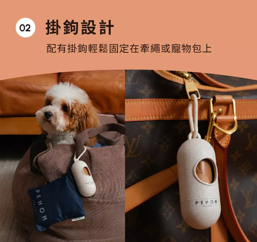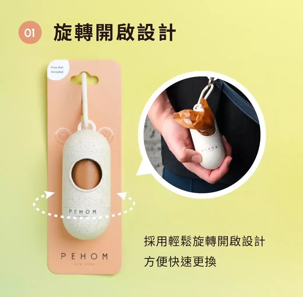 採用旋轉開啟設計,輕鬆更換拾便袋,搭配掛鉤,可固定於牽繩或寵物包上,攜帶方便。拾便袋附淡雅小蒼蘭香氣,有效減少異味,讓清理更舒適。由可生物降解玉米澱粉製成,防漏耐用,容量充足
