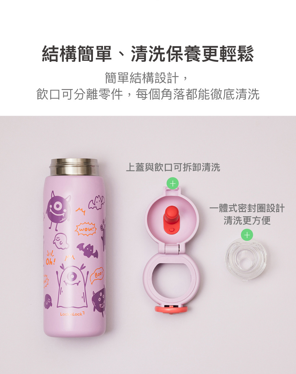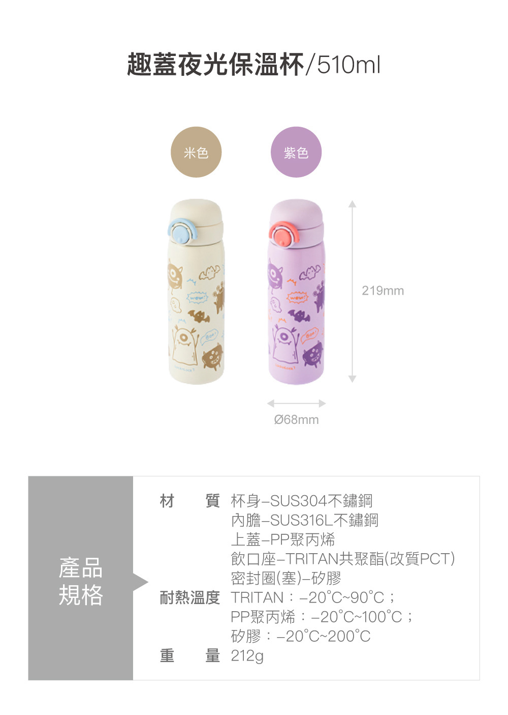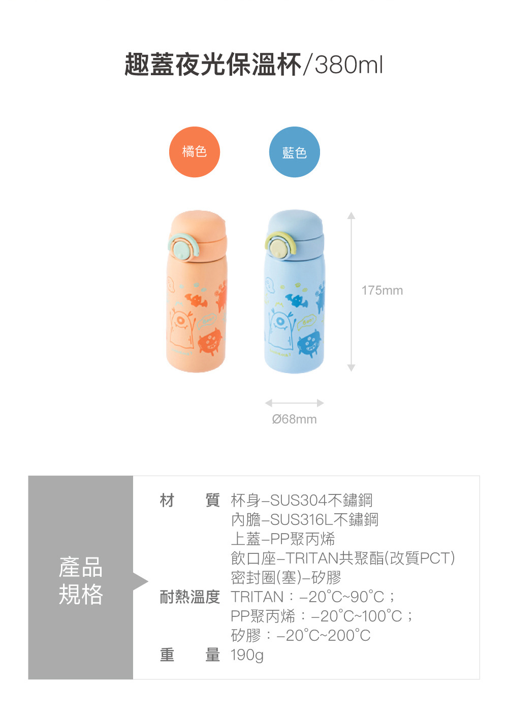 杯身-SUS304不鏽鋼;內膽-SUS316L不鏽鋼;上蓋-PP聚丙烯;飲口座-TRITAN共聚脂(改質PCT);密封圈(塞)-矽膠