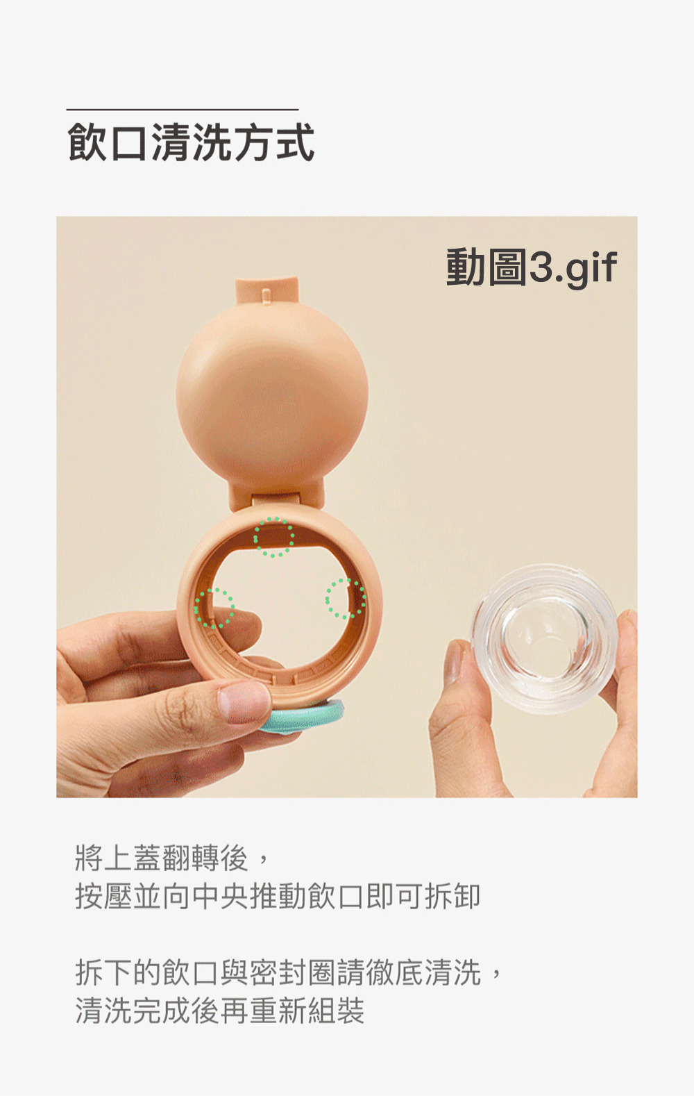 4.杯蓋不宜長時間高溫消毒,可能造成變形。請勿用粗刷或研磨劑清洗瓶身,請勿長時間保存牛奶、嬰兒食品以避免食品本身變質。