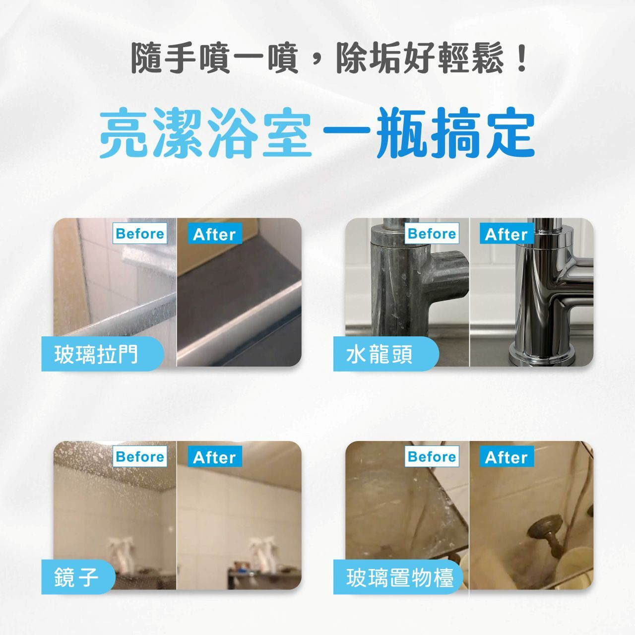 亮潔浴廁:玻璃、磁磚、水龍頭、磁磚