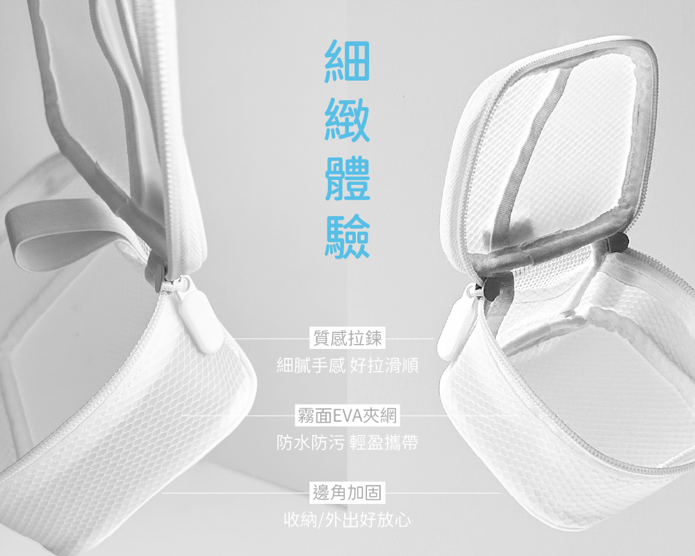 · 網狀口袋、夾層、密封袋,分類整潔。